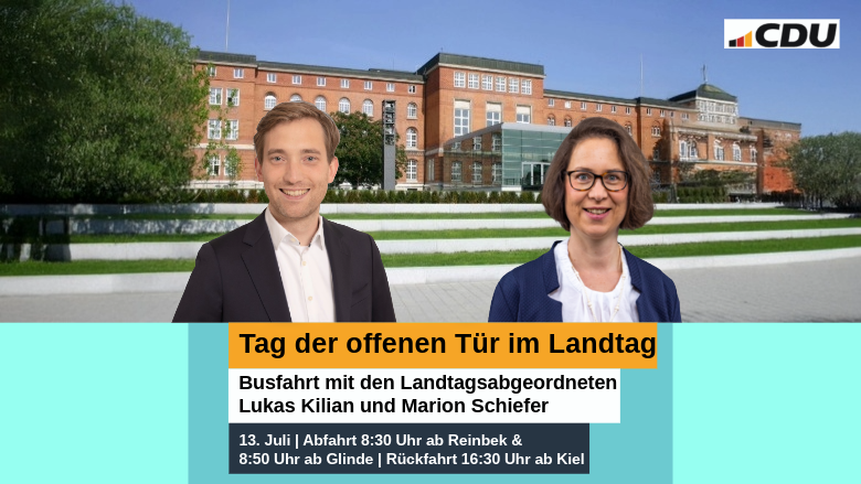 Wir, die CDU-Landtagsabgeordneten Lukas Kilian und Marion Schiefer, möchten Sie herzlich einladen, gemeinsam mit uns in einem Reisebus aus dem Kreis Stormarn-Süd nach Kiel zum Tag der offenen Tür zu fahren. Eine Anmeldung ist ganz einfach unter wahlkreisbuero.kilian [at] gmail.com möglich.